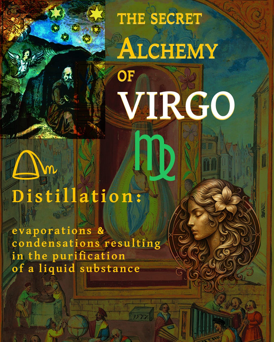 The Alchemical Operation assigned to Virgo is Distillation. Distillation is the process of making something more pure or refined. In psychological terms, Distillation can be seen as repeatedly separating and recombining the “subtle and gross” aspects of the personality, and with each repetition, gaining more clarity and refinement. Spiritual Distillation is the process of deliberately agitating and elevating the psyche, to ensure that issues locked or stuck in the subconscious or deliberated repressed are brought ito the fore to be dealt with. This process enables our true inner self, our inner light, to begin to become brighter and less bogged down, as we start to live from a place of truth. It is true “psychologial work” and is not for the feint hearted. But as we begin to shine, we become our own beacon, and a beacon for others to follow. Hence the correspondance to the Hermit card in the Tarot, which symbolizes the light shining in the darkness.